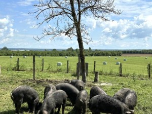 Ferme en AB avec élevage de porcs gascons et de vaches allaitantes. Verger et chanvre. Salaisons, charcuteries, plats cuisinés, confitures, huile de noix, macérât et savons